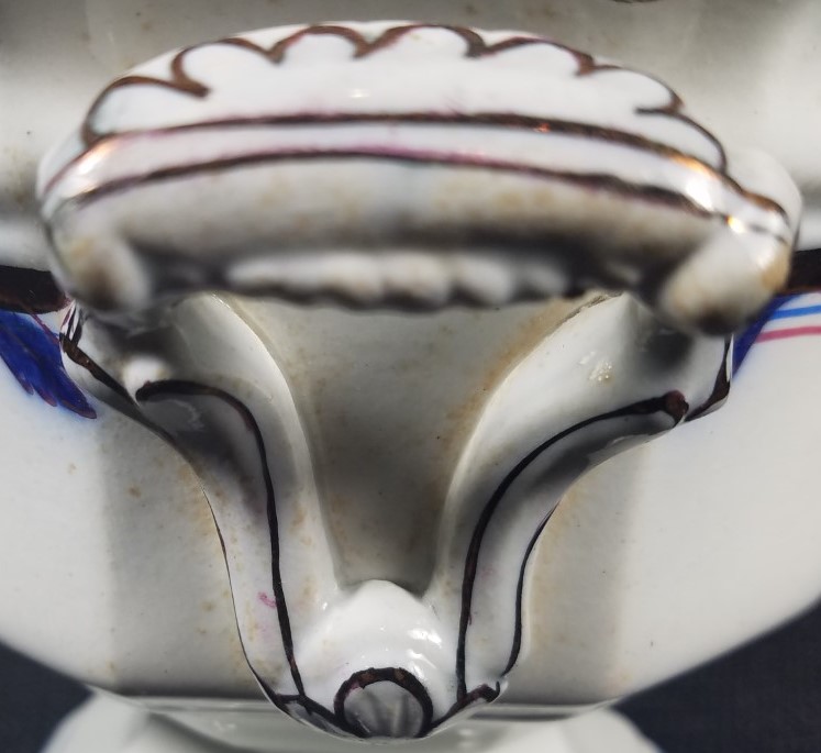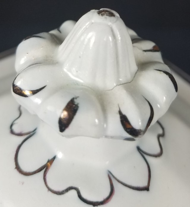 One of the earliest body styles to be decorated with copper lustre motifs, Classic Gothic is characterized by its octagonal shape. Pitchers and teapots have bracket handles, while sugar and vegetable dishes have spiraled ear handles.