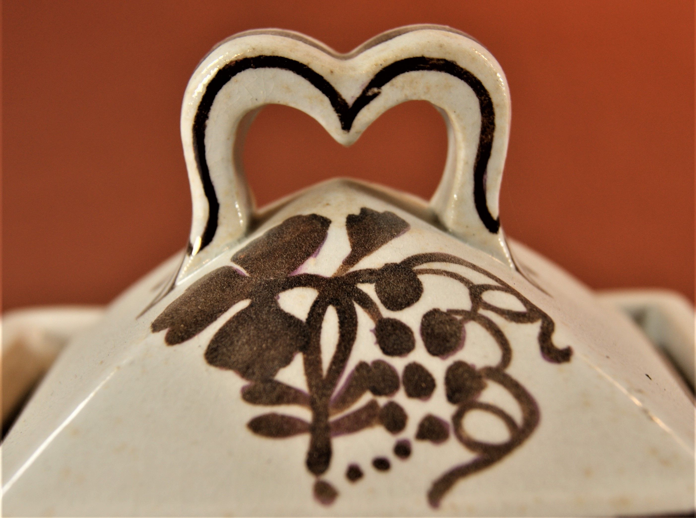 This late Clementson Brothers bulbous square body style presents a very sturdy appearance. The angular lines and wide horizontal band at the terminals of the bracket handles are a precursor of the Arts and Crafts movement that supplanted Victorian fussiness.