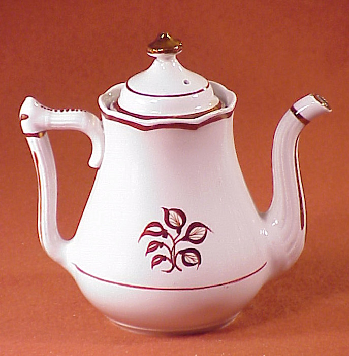 BiographyCrystal is a very plain bulbous style potted by two famous producers of Tea Leaf ironstone. The only difference in the teapots is the rim style. Clementson used a flanged simple rim while Elsmore & Forster scalloped their flanged rim. Elsmore & Forster uses a heavily lustred knob finial.