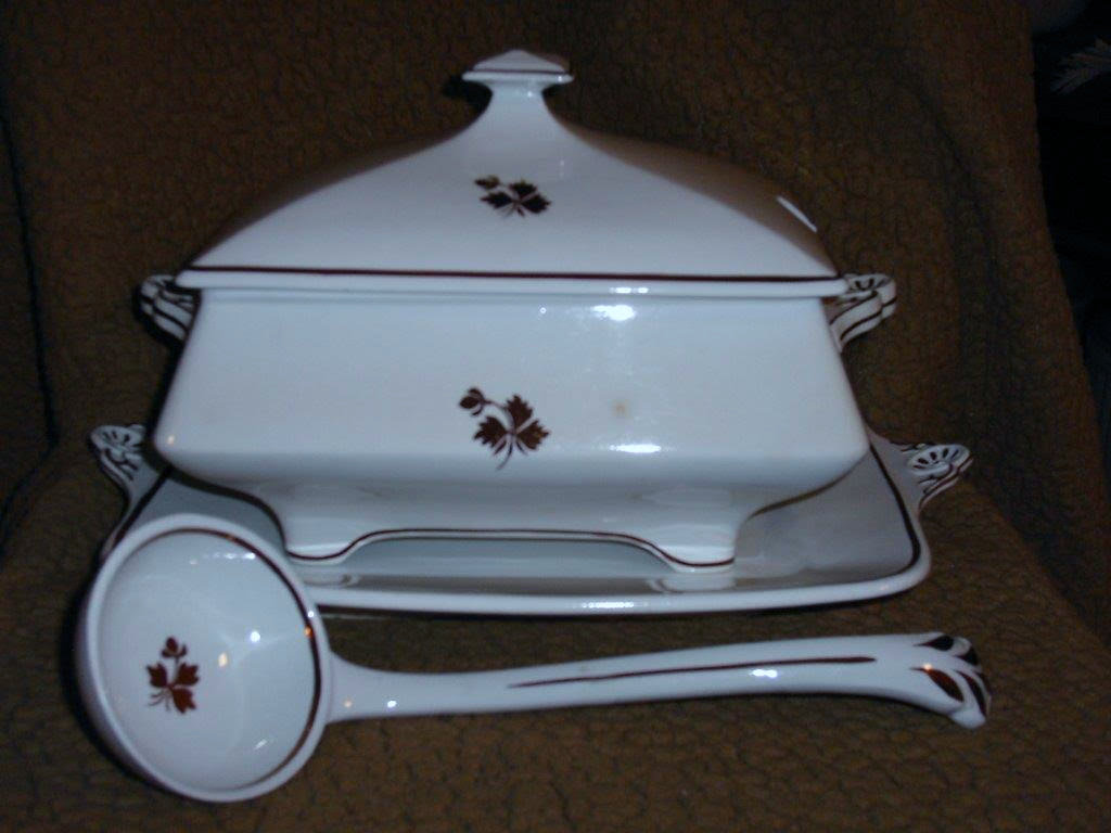 A complete four-part soup tureen in the Daisy body style includes a base, lid, undertray and ladle. A beautiful set.