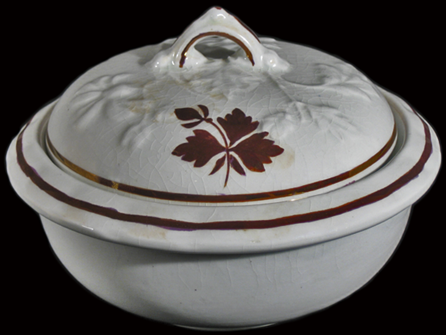 This soap dish is identified by the lavish Chrysanthemum like embossing on the top of the lid. It has an inside liner. The piece was registered in 1886.
